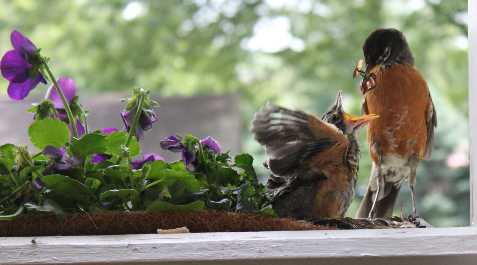 We have all learned so much about the growth and habits of robins from our daily observation and I'm just so thankful that they chose our house for their nests. I have already documented the nests in albums on facebook, but for those of you who aren't there, I thought I'd share a few photos from the mother robin feeding her babies today. The babies are 13 days old today so almost ready to leave the nest. The mother robin now allows me to be two feet away when she feeds her birdlings, so today I took advantage of her trust by taking these photos: